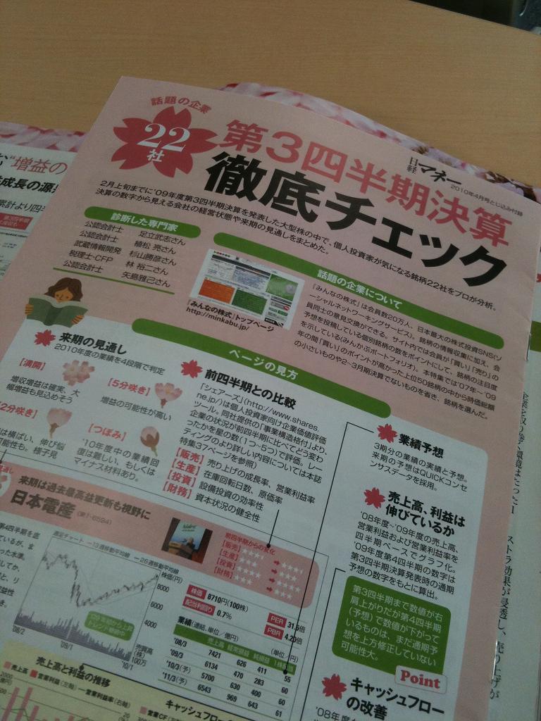 2010/02/25 - 川島 寛貴(Kshima)さんの株式ブログ。タイトル:「【掲載のお知らせ!】今月号の日経マネーにみんかぶ掲載!」 本文:こんばんわ~ Kshimaです。 今月号の日経マネーの特集「第三四半期決算 徹底チェック」の