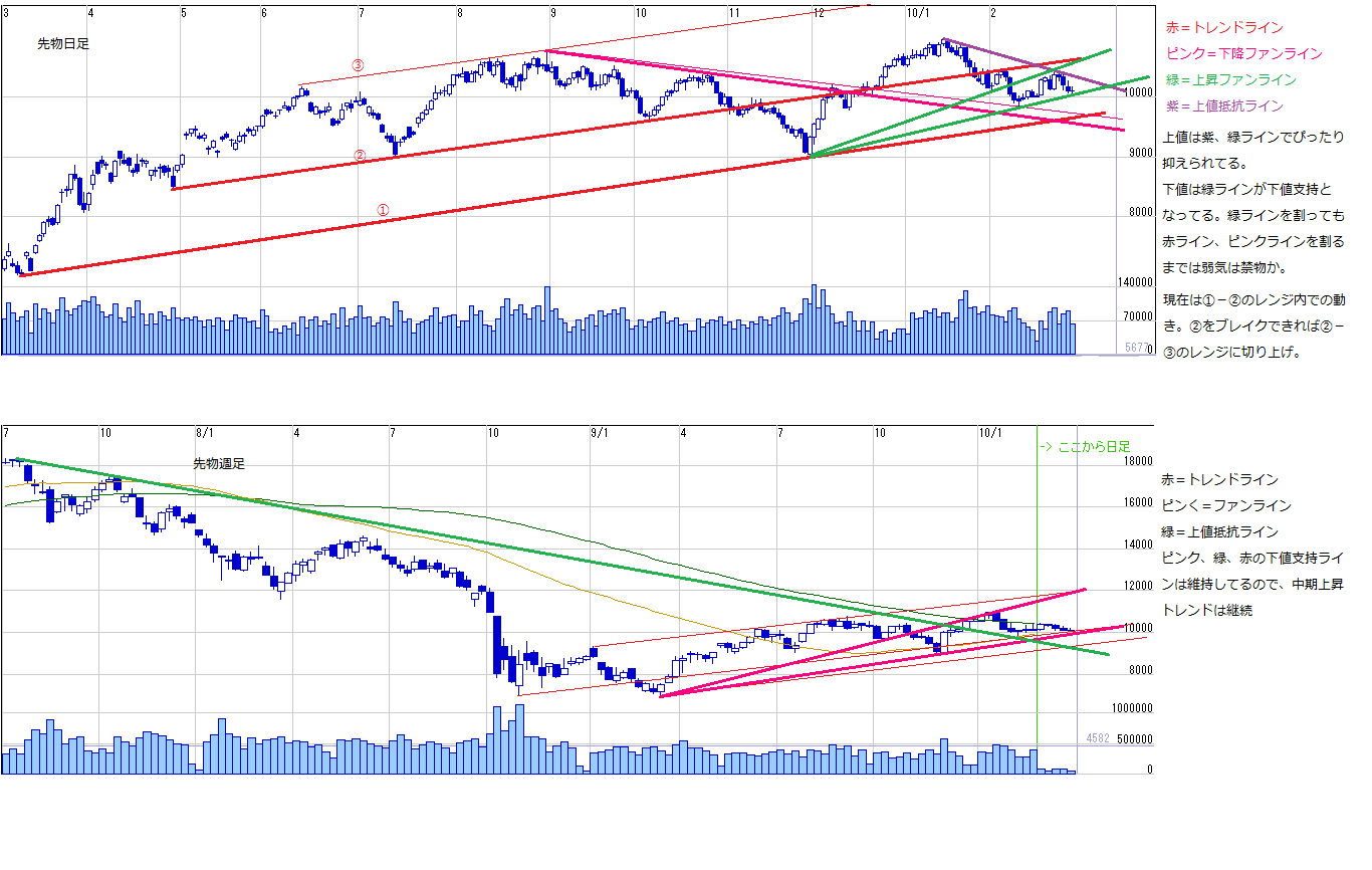 2010/02/27 - 月とスッポンさんの株式ブログ。タイトル:「来週のチャートポイント①」 本文:☆トレンドラインとファンライン(画像1) ・おおまかにみると、現在は①-②のレンジ内での動き。