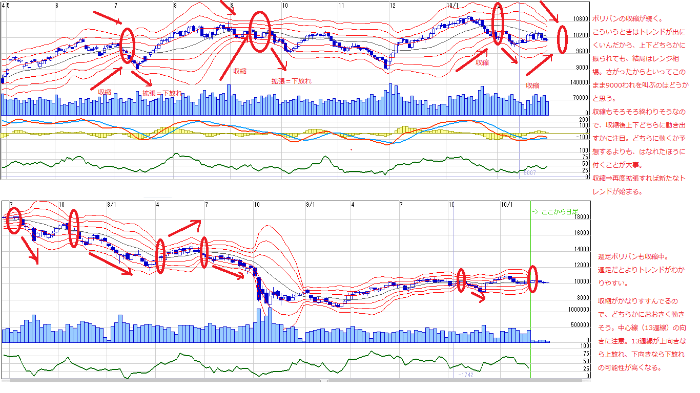 ・ただし、ボリバンの収縮がかなりすすんでいるので、どちらかに放れる予兆であるので注意。放れたほうに大きなトレンドが発生する。