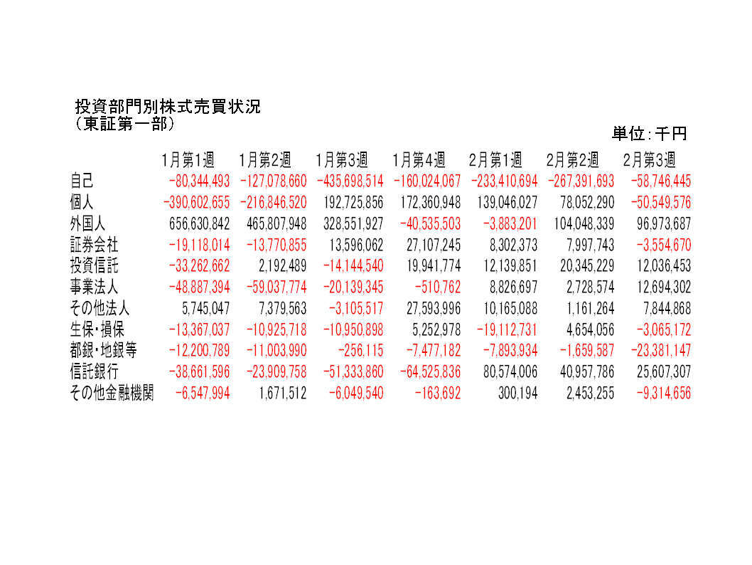 2010/02/28 - フォーナインさんの株式ブログ。タイトル:「投資部門別株式売買状況(東証第一部)」 本文:今年に入ってからの分をエクセルに落としてみました。 証券自己と都銀・地銀等がずっと売り越し状態です。 今は投信と信託銀行が買い支えているような感じでしょうか。