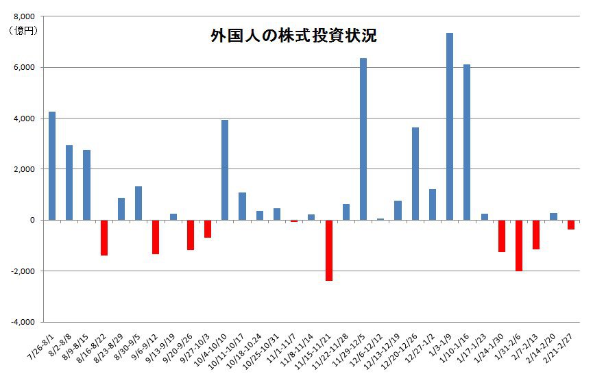 2010/03/04 - tetsuさんの株式ブログ。タイトル:「対外及び対内証券売買契約等の状況」 本文:対内証券投資【非居住者による取得・処分】←外国人 平成22年2月21日~2月27日 株式 取 得 処 分 ネット 3,926 4,303 △377