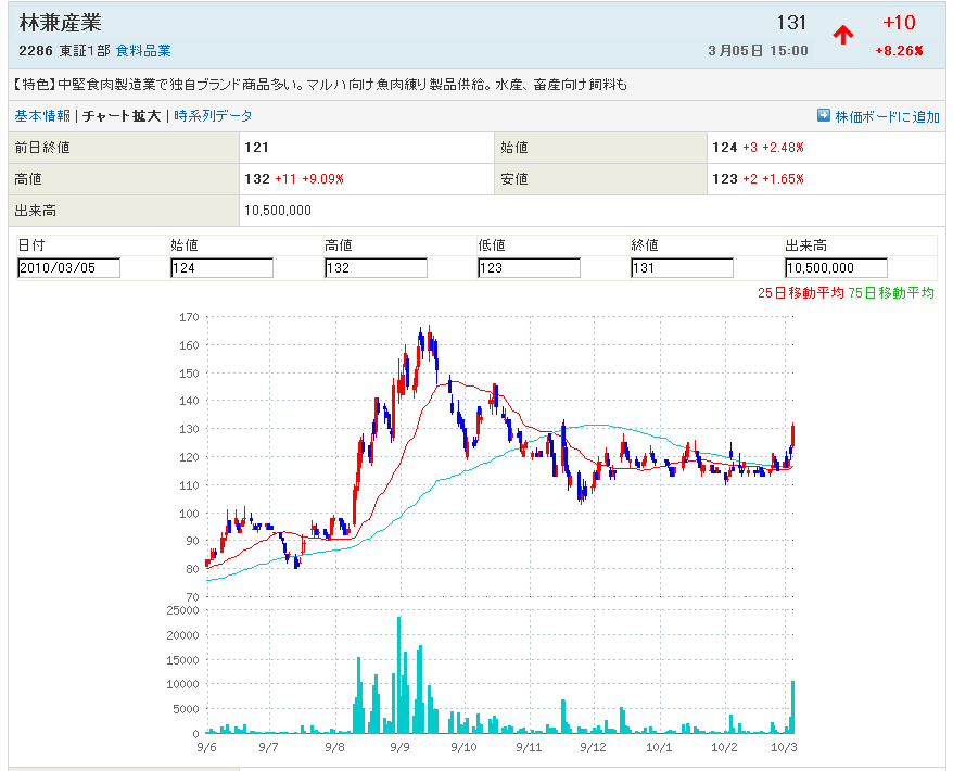 2010/03/05 - rikakusenninさんの株式ブログ。タイトル:「2286:林兼産業がおいしそうですとな???」 本文:2286:林兼産業がおいしそうな上げかたです 銘柄コード2286 は、ニコニコハムと覚えましょう トットコハム太郎と覚えるのもいいかな? 9年11月の133も超えるでしょう