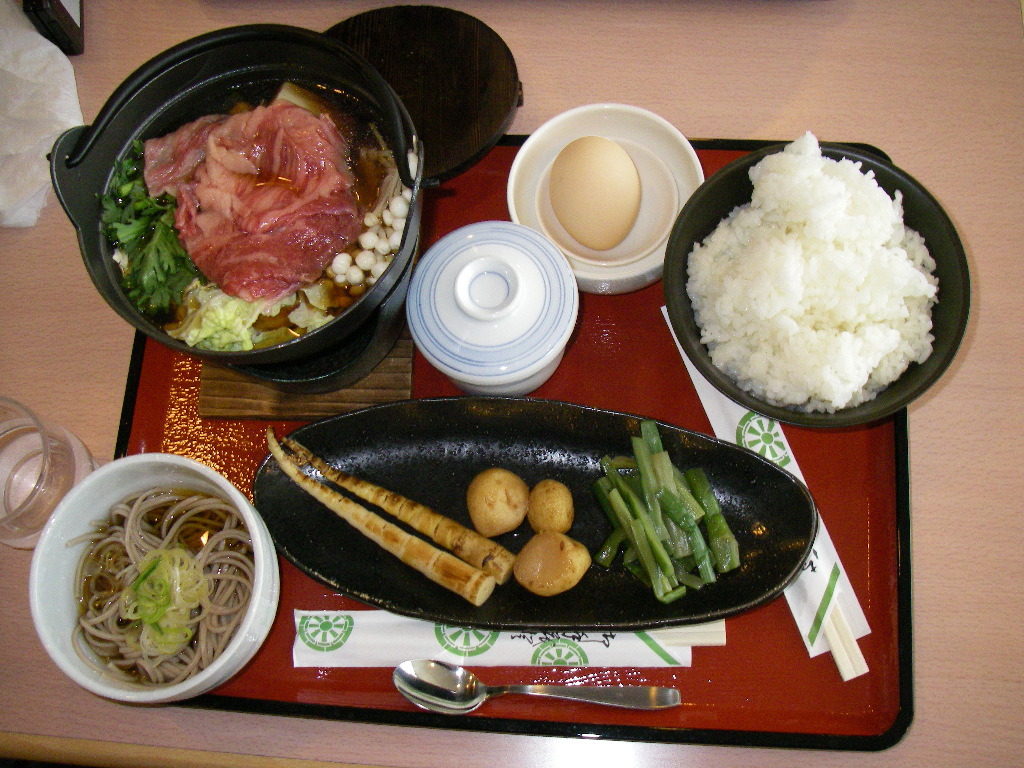 昼食は飛騨牛すき焼き定食、蕎麦はかなり美味、付け合せの焼き姫竹、ジャガイモ煮付けも美味、すき焼きの肉も和牛の香りして美味これで1800円は納得。