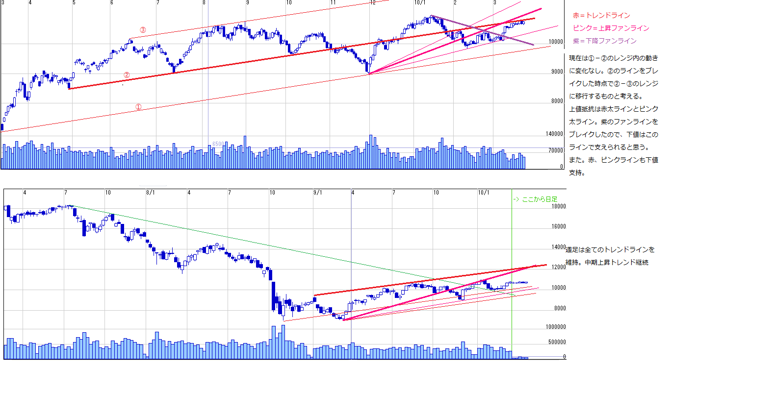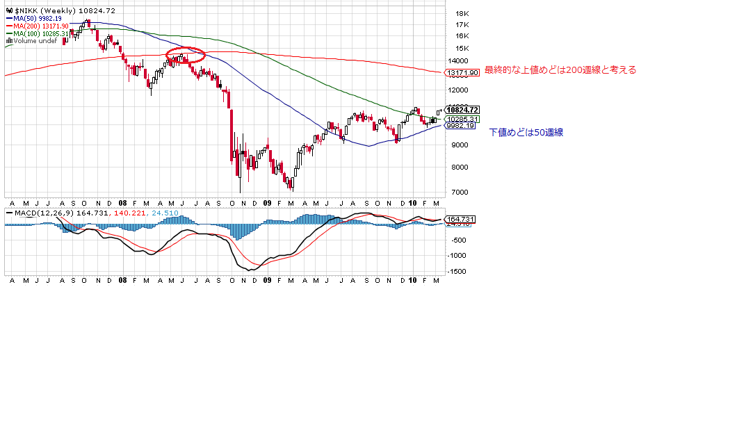 2010/03/21 - 月とスッポンさんの株式ブログ。タイトル:「来週のチャートポイント①」 本文:☆トレンドラインとファンライン(画像1) ☆週足移動平均線(画像2) 50週-100週のレンジ相場から50-200週のレンジ相場へ移行。100週が下値支持となるか。 ☆ボリバン(画像3)
