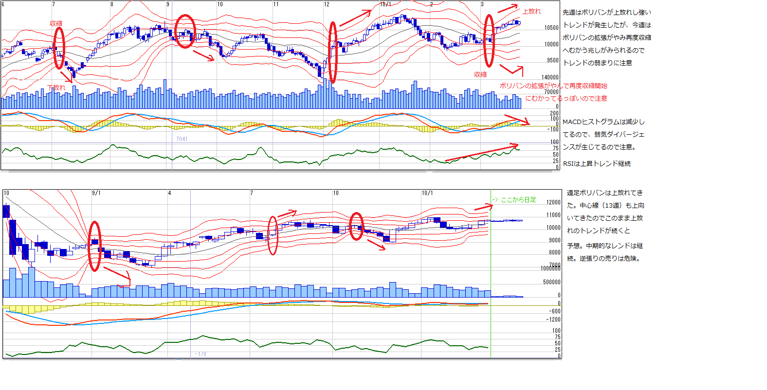 ・日足ボリバンは上放れて拡張が続くが、若干拡張がやみ、収縮へ向かいそうなかんじがするので注意。