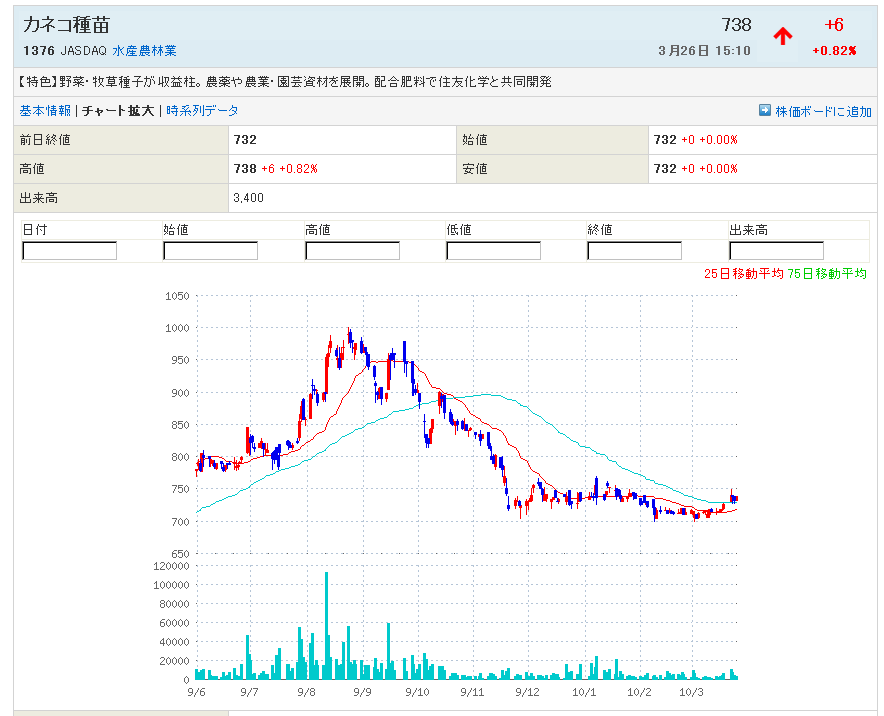 2010/03/28 - rikakusenninさんの株式ブログ。タイトル:「1376:カネコ種苗 蒔かぬ種は生えぬとな???」 本文:1376:カネコ種苗 蒔かぬ種は生えぬと言います 2009年8月高値1001から調整して、休養中、種子の温存中という形です 種を蒔こう!春に蒔き、夏に咲き、秋に実る・・・・・