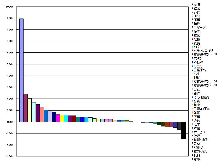 2010/04/02 - tetsuさんの株式ブログ。タイトル:「指数・業種別騰落ランキング」 本文:1.石油 8.96%(-0.06%) 2.鉱業 2.40%(-0.23%) 3.非鉄 2.03%(-0.70%) 4.保険 1.69%(1.12%) 5.海運 1.51%(-0.20%)