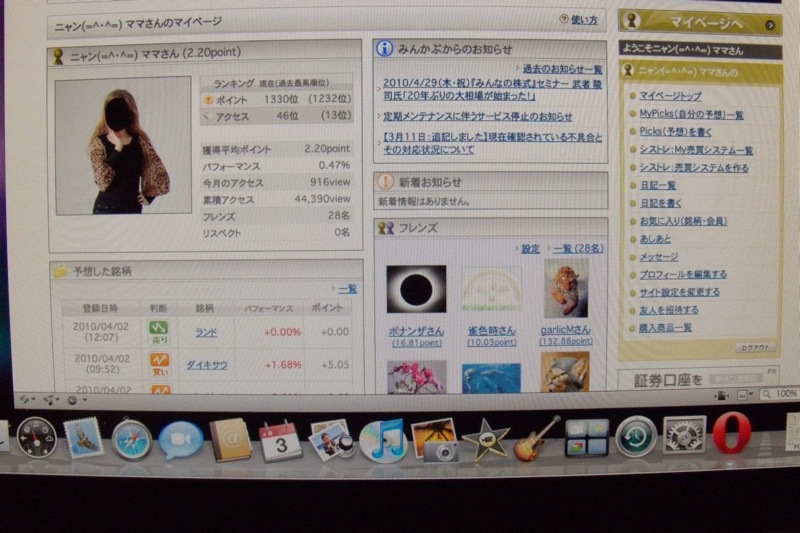 2010/04/03 - ニャン(=^・^=) ママさんの株式ブログ。タイトル:「Macハード取っ替え完了」 本文:直りました〜! 47764円の請求書 涙 いつもながらお金がない 困ったけど、カード決済して さっさと持ってかえってきました。 またヤマトが連絡もなく取りにこないと
