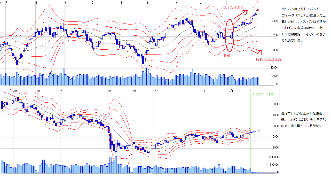 2010/04/04 - 月とスッポンさんの株式ブログ。タイトル:「来週のチャートポイント①」 本文:☆トレンドライン、ファンライン(画像1) ☆週足移動平均線(画像2) ☆ボリバン(画像3) ボリバンの収縮についてはこちら