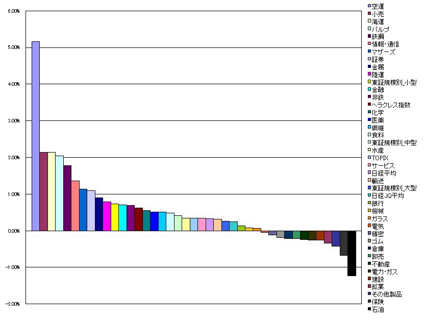 2010/04/09 - tetsuさんの株式ブログ。タイトル:「指数・業種別騰落ランキング」 本文:1.空運 5.17%(0.37%) 2.小売 2.14%(-0.15%) 3.海運 2.14%(-1.01%) 4.パルプ 2.05%(1.01%) 5.鉄鋼 1.78%(-1.10%)