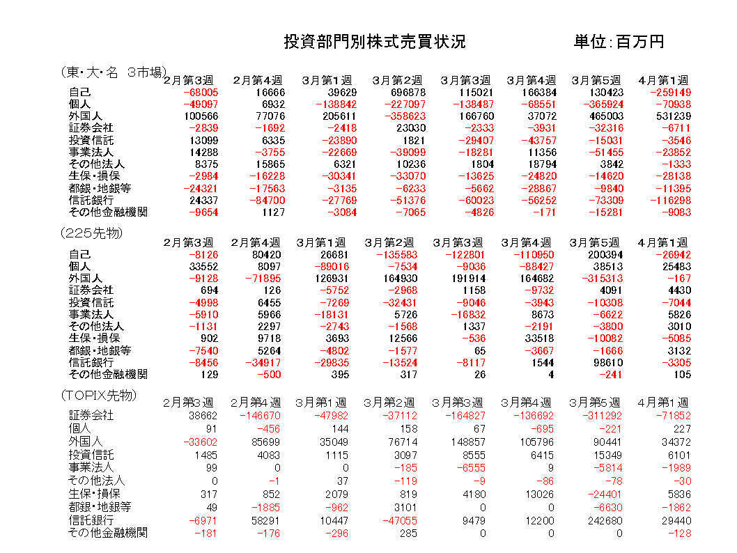 2010/04/18 - フォーナインさんの株式ブログ。タイトル:「投資部門別株式売買状況-4」 本文:直近の週の分を追加しました。 都銀・地銀等は年初からひたすら売り越し。いつまで続くのでしょうか。 信託銀行の売り越しが更に高水準になりました。先物についてはTOPIXのみ買い越し継続です。