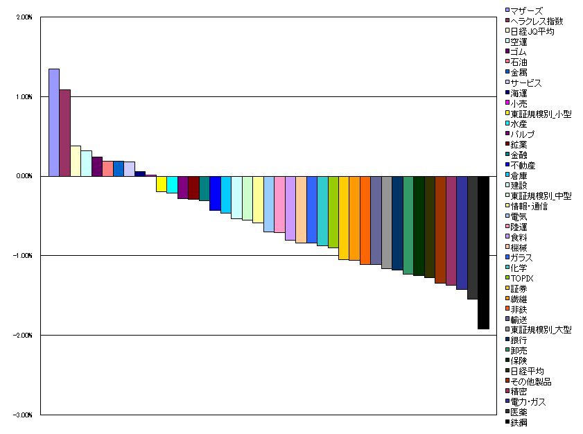 2010/04/22 - tetsuさんの株式ブログ。タイトル:「指数・業種別騰落ランキング」 本文:1.マザーズ 1.34%(2.20%) 2.ヘラクレス指数 1.08%(2.61%) 3.日経JQ平均 0.38%(0.54%) 4.空運 0.32%(3.76%) 5.ゴム