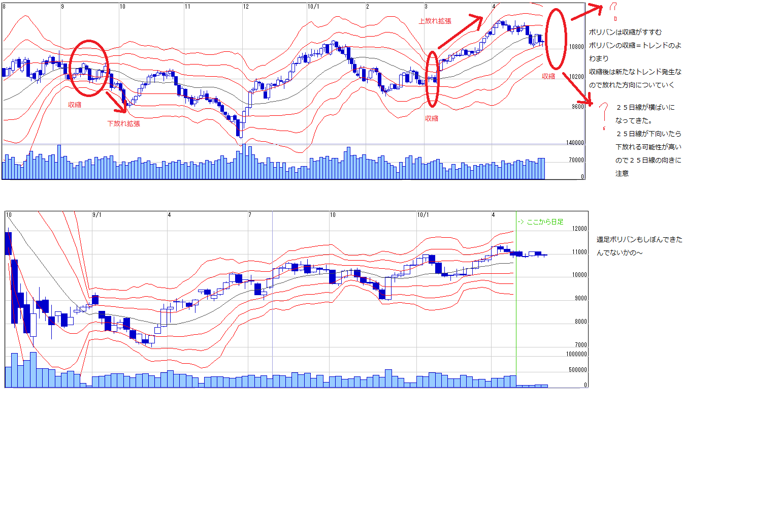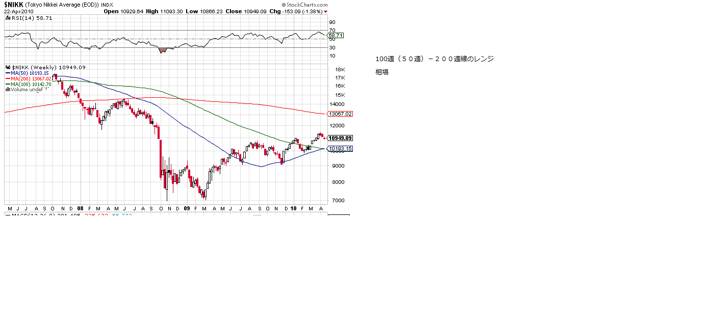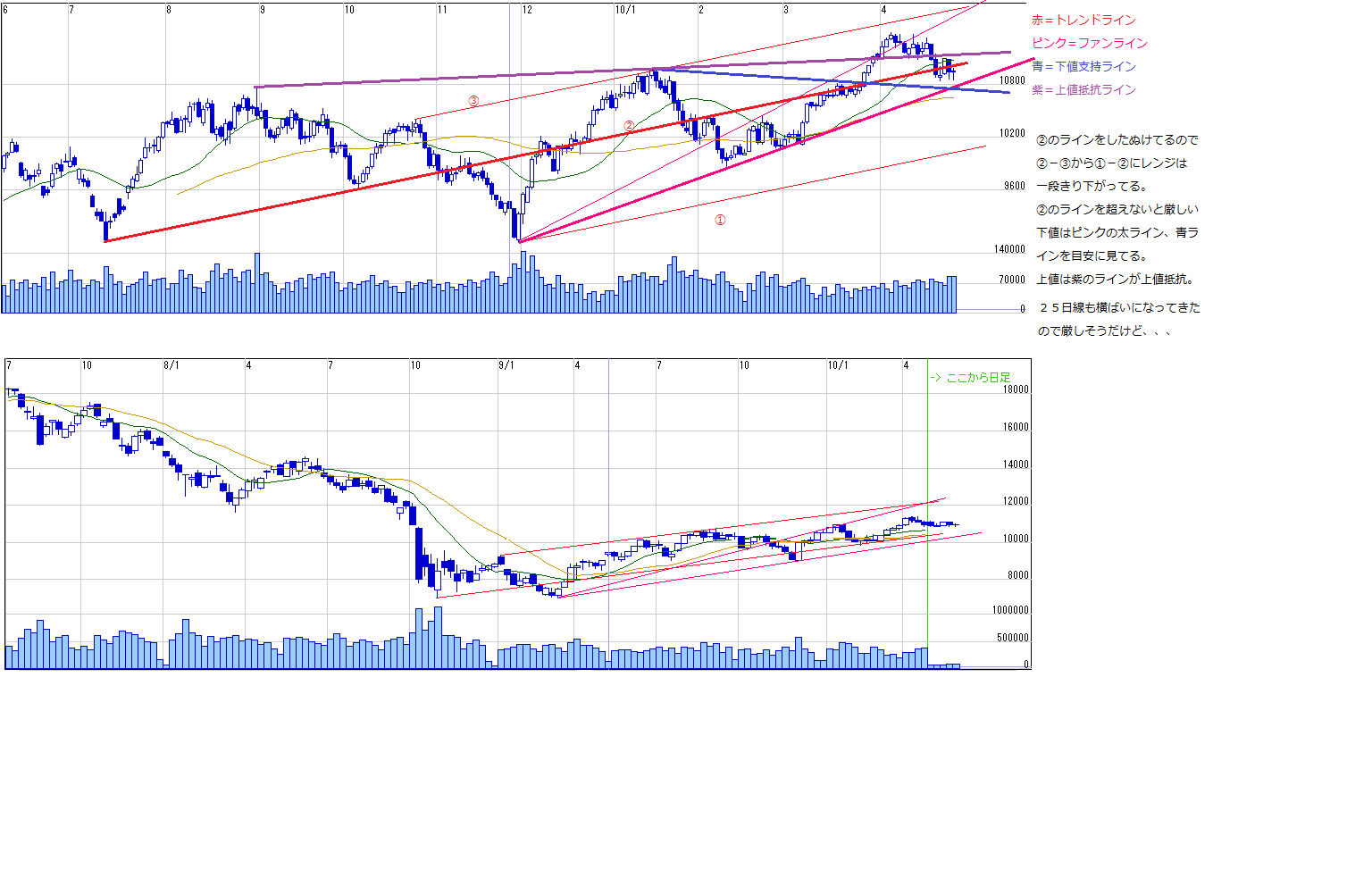 2010/04/24 - 月とスッポンさんの株式ブログ。タイトル:「来週のチャートポイント①」 本文:☆トレンドライン、ファンライン(画像1) ☆週足移動平均(画像2) ☆ボリバン(画像3) ボリバンの収縮についてはこちら