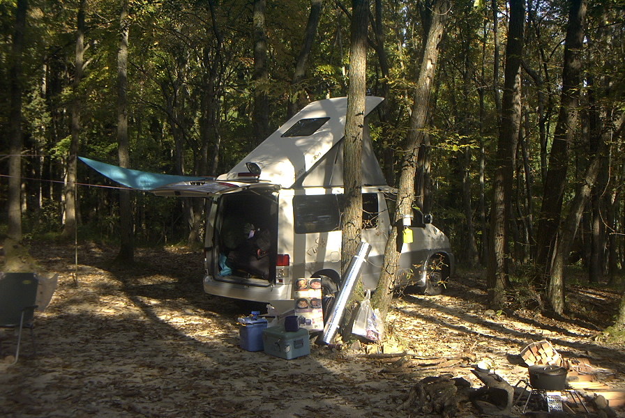 キャンプ場も貸切状態暗くなったら楢の樹間で焚き火を囲み酒が入れば思い出話や株談義。