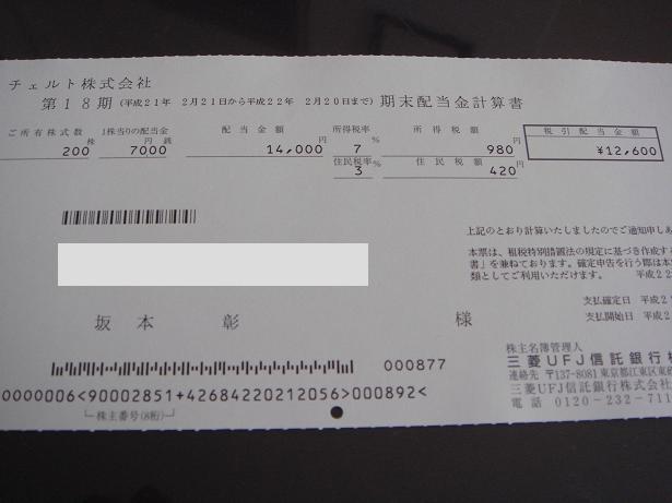 2010/04/28 - 坂本彰さんの株式ブログ。タイトル:「チェルト 配当金」 本文:チェルト 3354から配当金が届きました。 中間配当はないので、年1回、期末配当 のみとなりますが、1株70円なので大きいです。 イオンディライト 9787にM&Aされるので