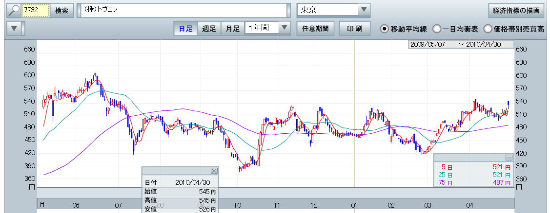 2010/05/05 - rikakusenninさんの株式ブログ。タイトル:「7732:トプコンに良い材料が出たけど買わない・・」 本文:7732:トプコンに良い材料が出たけど買わないつもりです 日足で見ると、モミを上抜けしそうです うまく行けば2009年の613を抜くかも??? でも、私は買いません