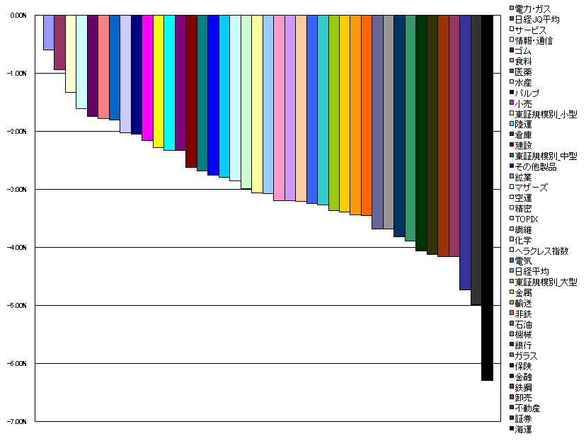2010/05/06 - tetsuさんの株式ブログ。タイトル:「指数・業種別騰落ランキング」 本文:1.電力・ガス -0.60%(1.01%) 2.日経JQ平均 -0.94%(-0.17%) 3.サービス -1.33%(1.23%) 4.情報・通信 -1.61%(0.63%) 5.ゴム
