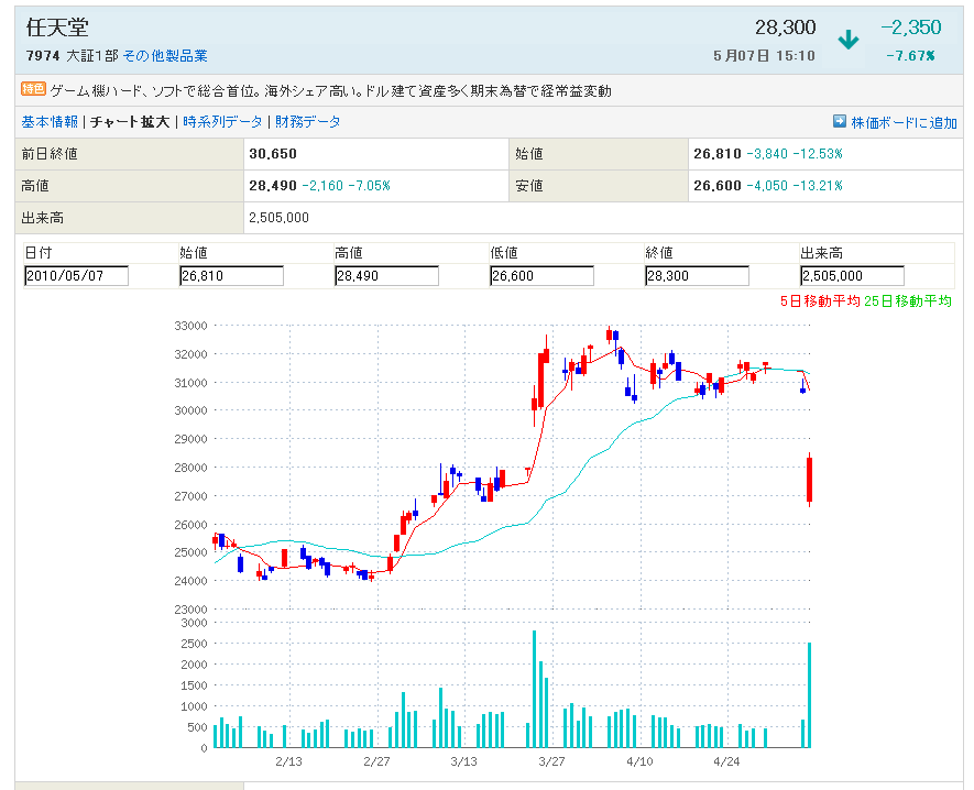 2010/05/08 - rikakusenninさんの株式ブログ。タイトル:「あんとき売ればよかったねーこ」 本文:あんとき売ればよかったねーこ:7974:任天堂 日足チャートに売りサインが見えます 写真のねこは、あんとき売ればよかったねーこです 成功した方は次も成功してください