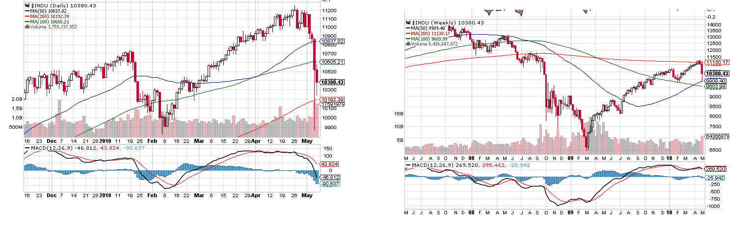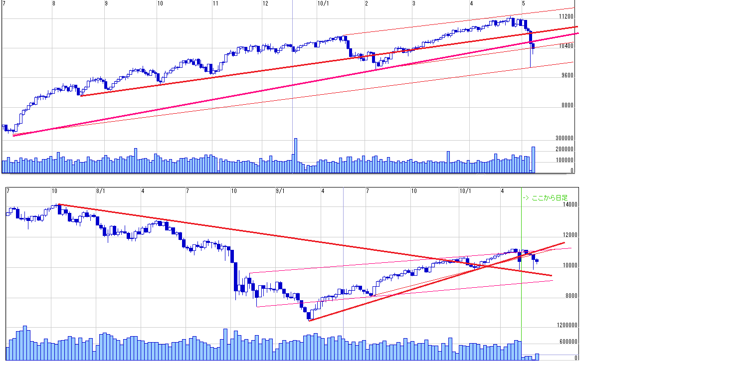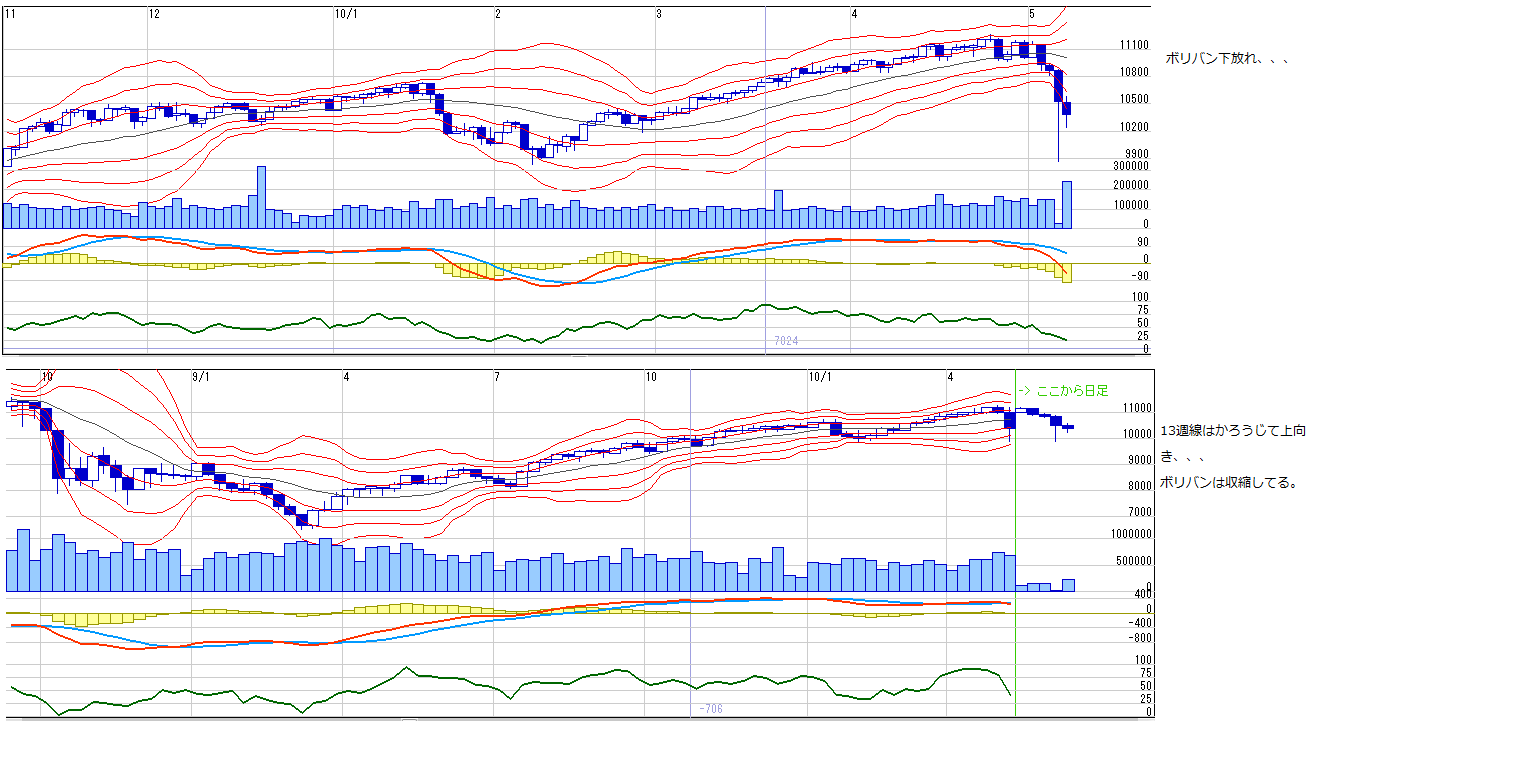 2010/05/08 - 月とスッポンさんの株式ブログ。タイトル:「来週のチャートポイント☆ダウ編①」 本文:☆とれんどらいん、ファンライン(画像1) ☆移動平均線(画像2) ☆ボリバン(画像3) ☆日経編は昨日の日記参照