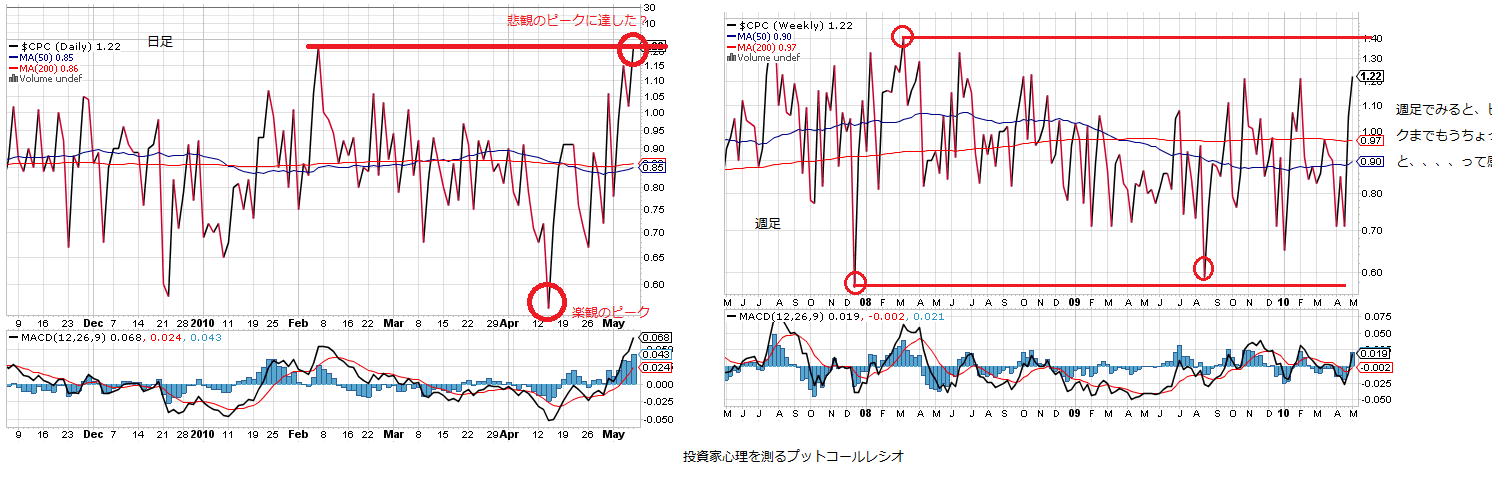2010/05/08 - 月とスッポンさんの株式ブログ。タイトル:「来週のチャートポイント☆NY編②投資家心理指標をチェック」 本文:今回は反発時期を探るために、以前紹介した投資家心理をはかる指標として、PCれしおとブリッシュパーセント指数を再度ご紹介いたします。 ☆ダウ月足(画像1) ☆プットコールレシオ(画像2)