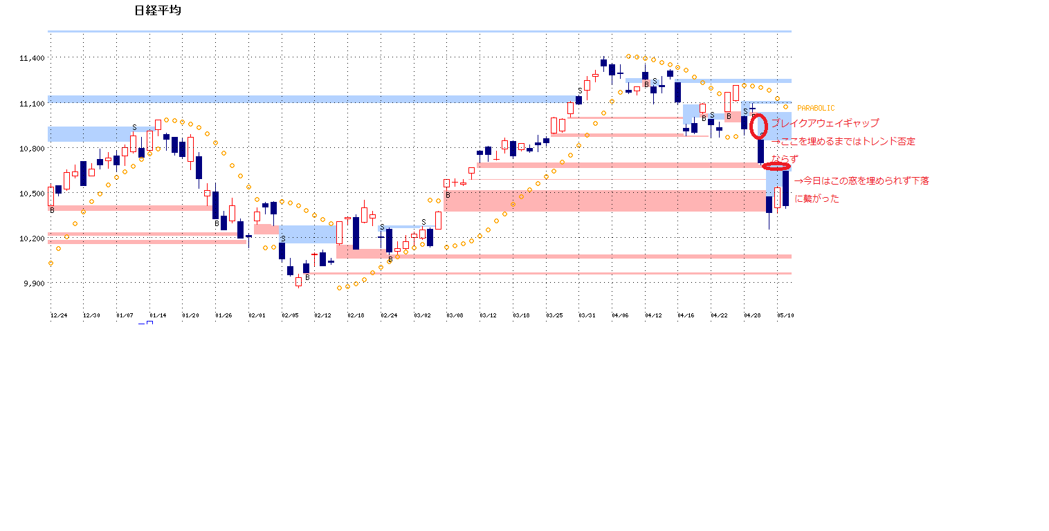 2010/05/11 - 月とスッポンさんの株式ブログ。タイトル:「本日のチャート②」 本文:☆窓(画像1) ブレイクアウェイギャップについては昨日の日記参照 ☆CMFとDMI(画像2)