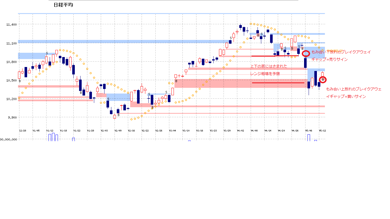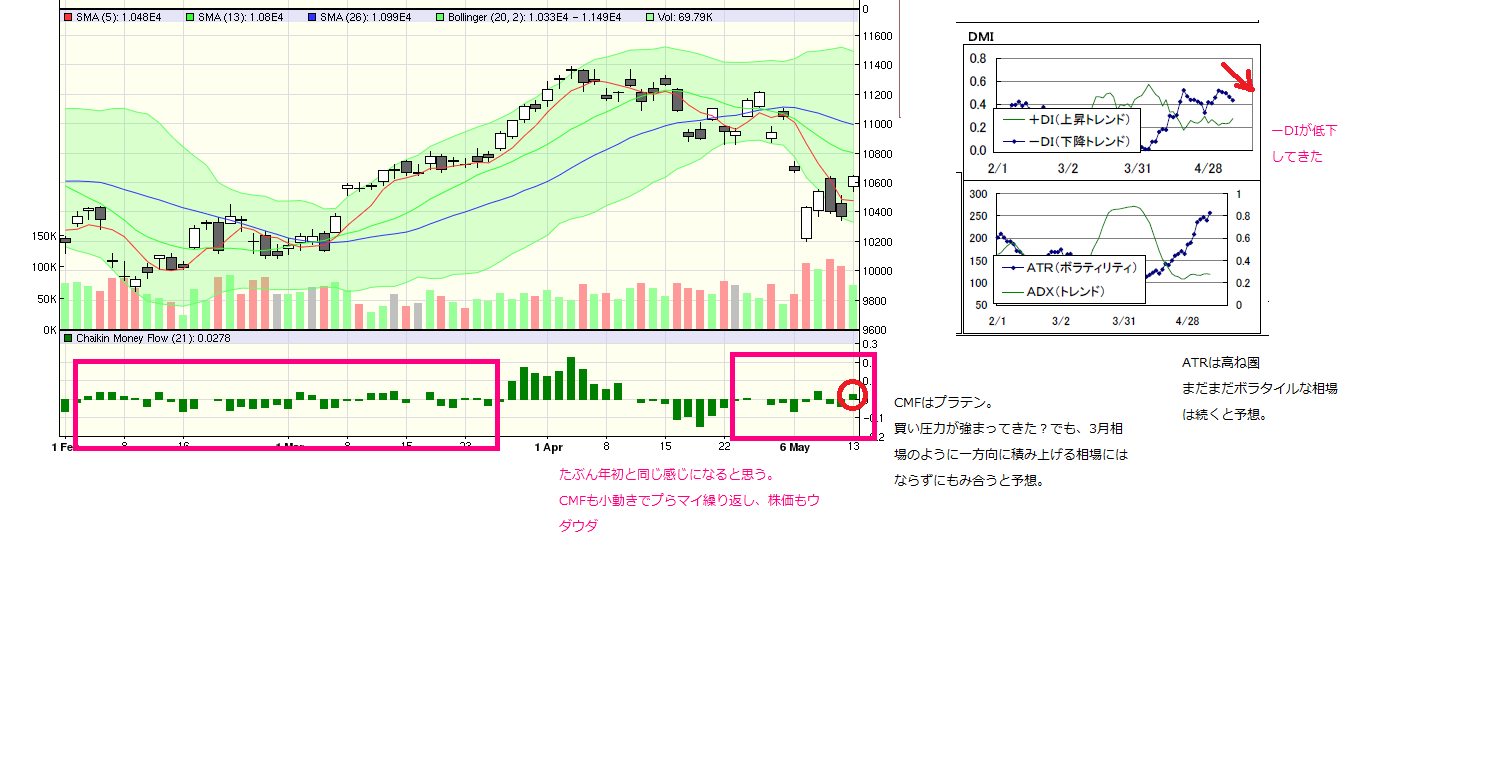 2010/05/13 - 月とスッポンさんの株式ブログ。タイトル:「5・13本日のチャート②」 本文:☆CMFとDMI(画像1) ☆窓(画像2)