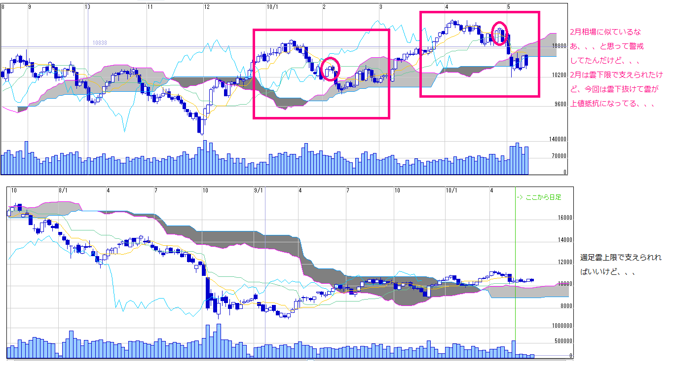 2010/05/15 - 月とスッポンさんの株式ブログ。タイトル:「来週のチャートポイント②日経下値めど」 本文:☆一目(画像1) ☆月足(画像2)(画像3) ☆エリオットは前提が崩れてきたので、再度シナリオ訂正中、、、 ☆下値目処は??