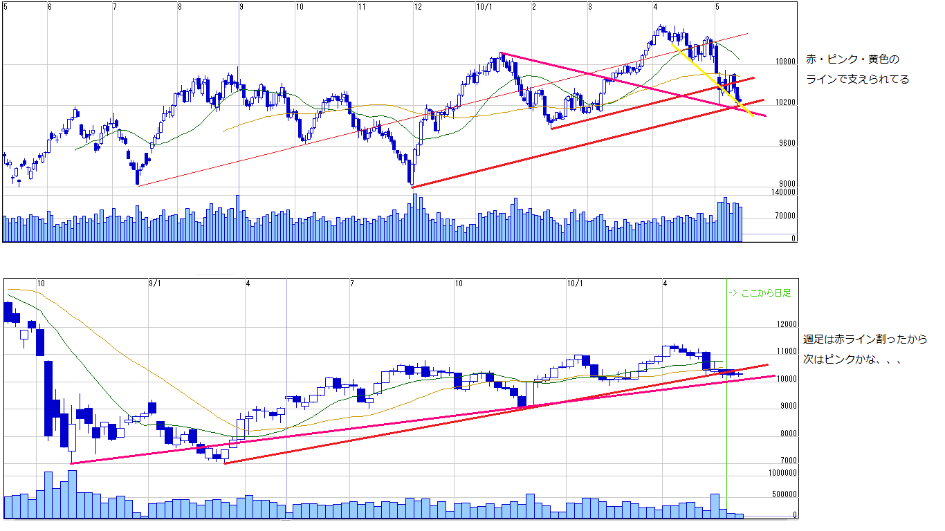 2010/05/18 - 月とスッポンさんの株式ブログ。タイトル:「5・18本日のチャート④下値を支えてるライン☆」 本文:追加で下値を支えてるラインです(画像1)