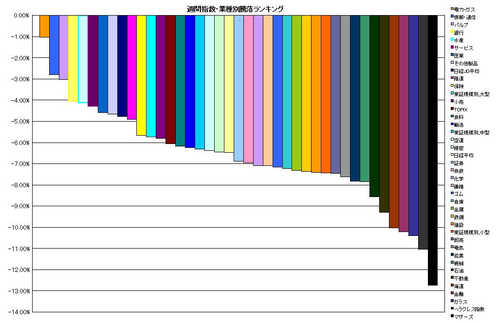 2010/05/21 - tetsuさんの株式ブログ。タイトル:「週間 指数・業種別騰落ランキング」 本文:1.電力・ガス -1.03%(-0.08%) 2.情報・通信 -2.79%(1.04%) 3.パルプ -3.03%(2.83%) 4.銀行 -4.04%(-0.27%) 5.水産