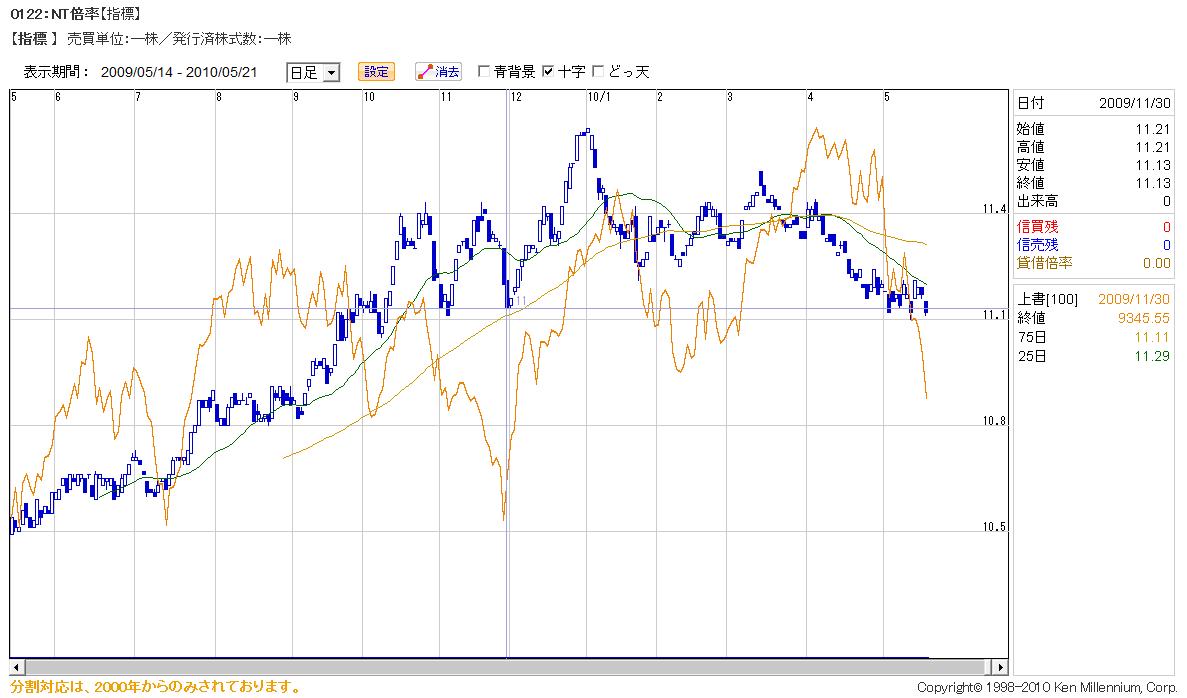 2010/05/22 - Newジェントルマンさんの株式ブログ。タイトル:「NT倍率とNK」 本文:昨日2/9の安値を割り込み起点を09/11/27の安値にせざるを得なくなった。