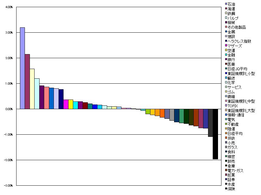 2010/05/24 - tetsuさんの株式ブログ。タイトル:「指数・業種別騰落ランキング」 本文:1.石油 3.19%(-3.16%) 2.海運 2.14%(-0.97%) 3.鉄鋼 1.58%(-1.80%) 4.パルプ 1.19%(-2.34%) 5.機械 0.92%(-1.80%)