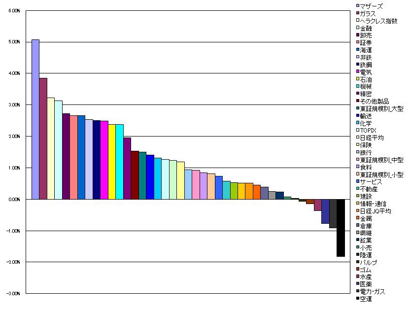 2010/05/27 - tetsuさんの株式ブログ。タイトル:「指数・業種別騰落ランキング」 本文:1.マザーズ 5.07%(1.95%) 2.ガラス 3.86%(-1.52%) 3.ヘラクレス指数 3.22%(0.40%) 4.金融 3.12%(-0.49%) 5.卸売