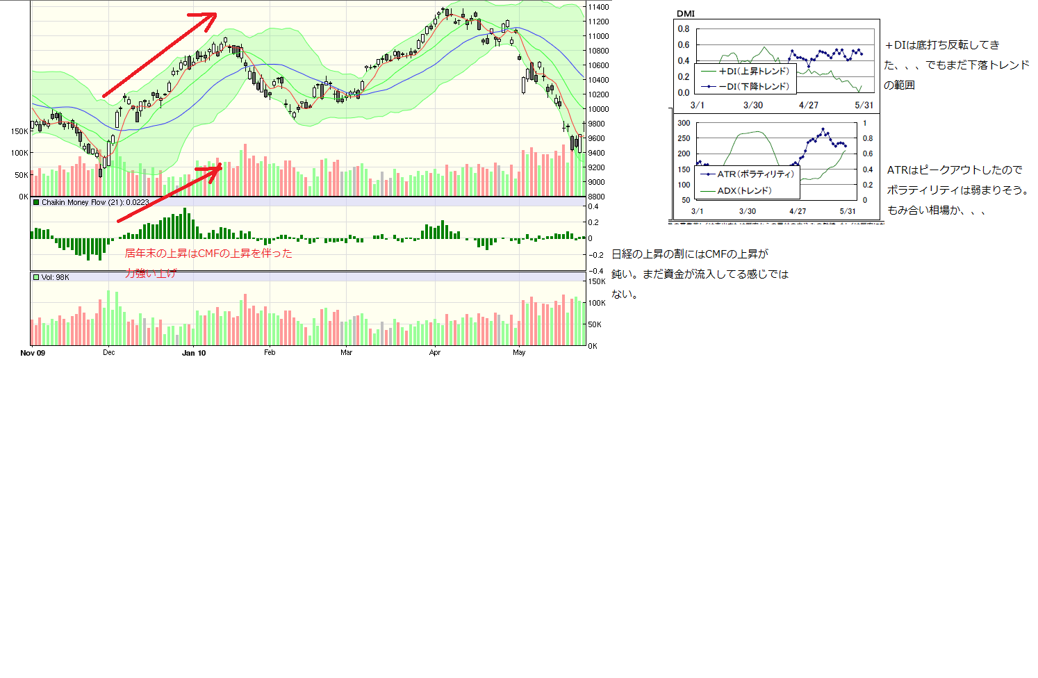 2010/05/28 - 月とスッポンさんの株式ブログ。タイトル:「5・28本日のチャート②」 本文:☆CMFとDMI(画像1) CMFみると、資金が流入してる感じではない。 11月と同じ展開を望むのは無理か、、、 ☆窓(画像2) アイランドリバーサルで一応強い買いサインだけど、、、