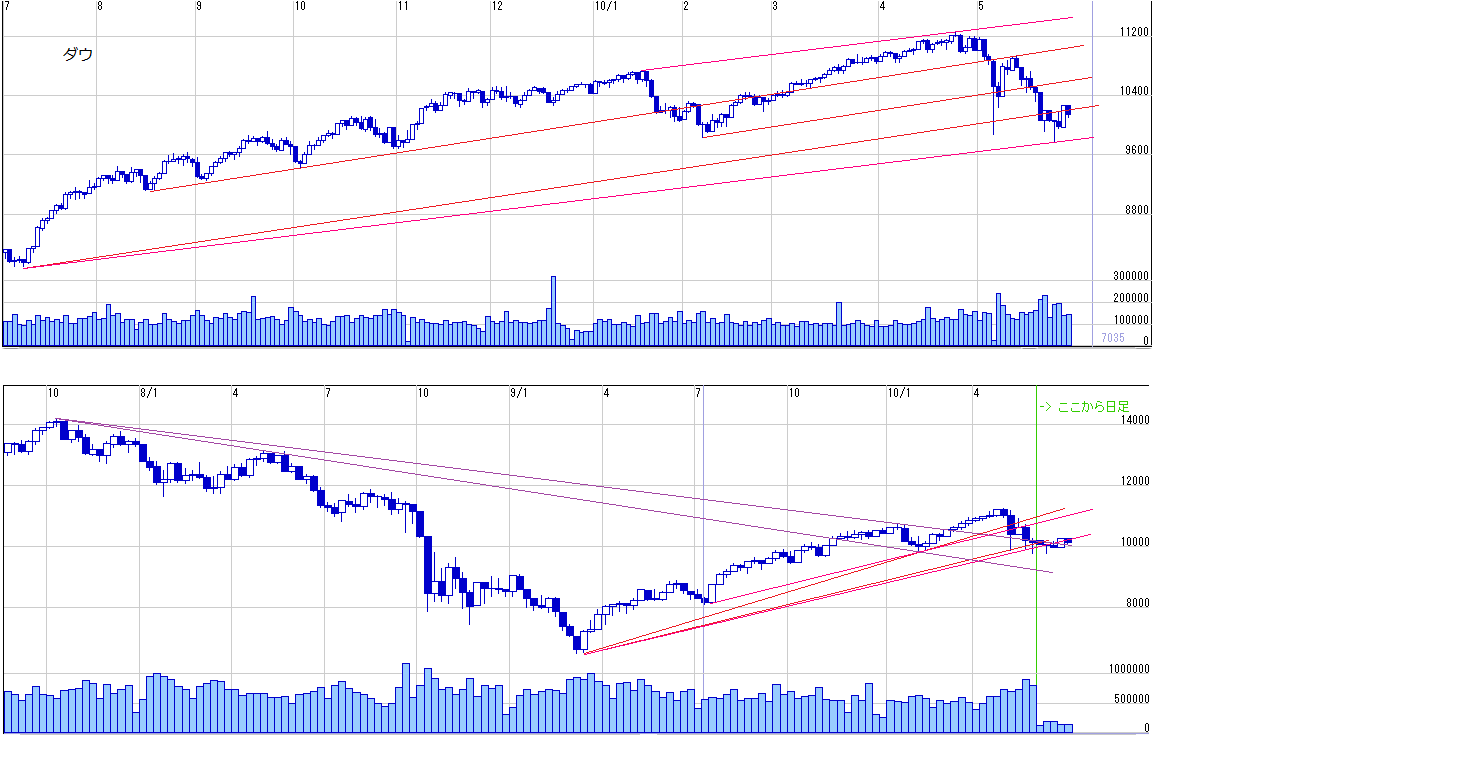 2010/05/29 - 月とスッポンさんの株式ブログ。タイトル:「来週のチャートポイント☆NY編①」 本文:☆ダウトレンドライン、ファンライン(画像1) ☆SP500トレンドライン、ファンライン(画像2) ☆ダウ移動平均線(画像3) 日経編はこちら