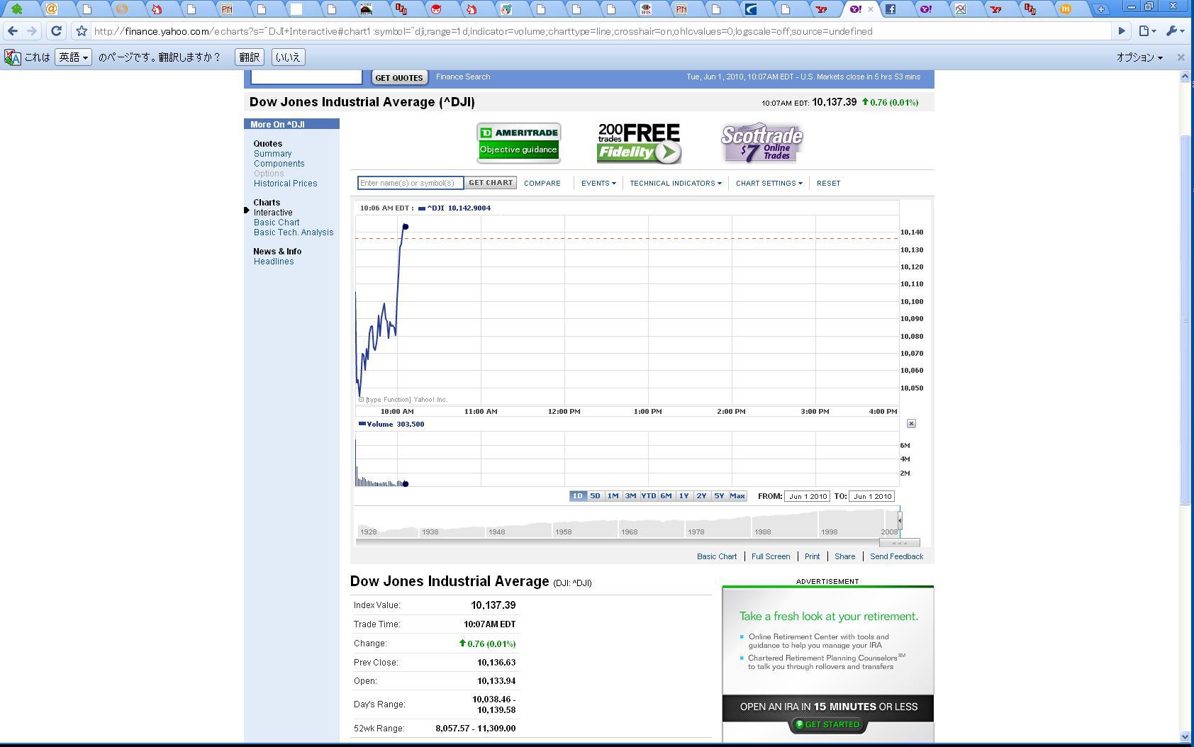 2010/06/01 - Micky G. Albertさんの株式ブログ。タイトル:「いったいなんで??ダウ急激回復!」 本文: