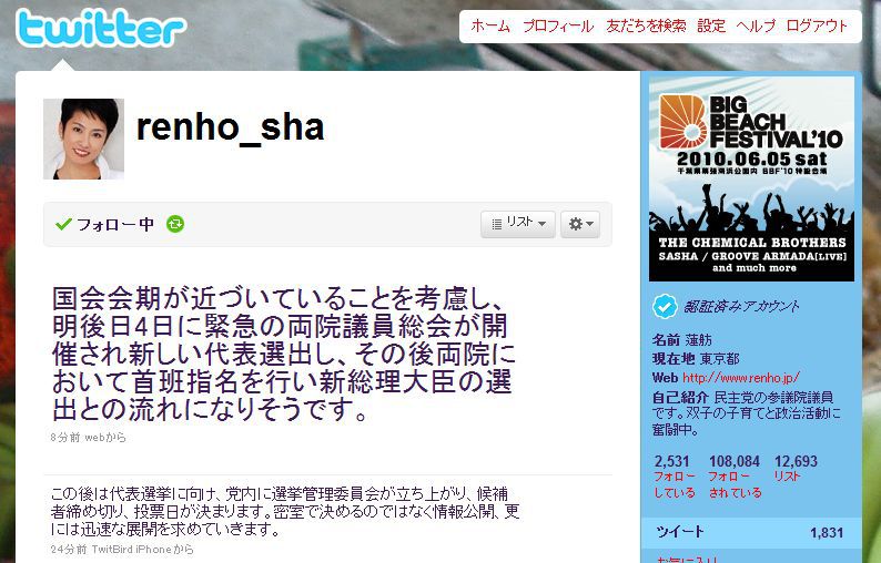 ツイッターで蓮舫議員のつぶやきを張り付けていただき見ましたが、リアルタイムで状況が分かるのがいいですね。