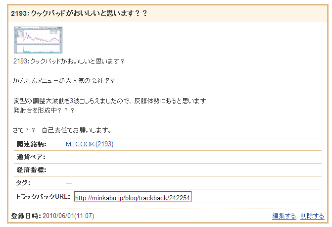 2010/06/03 - rikakusenninさんの株式ブログ。タイトル:「2193:クックパッドがおいしいと思います??」 本文:6月1日に、 2193:クックパッドがおいしいと思います?? と、日記を書きましたが、まさしく発射台でしたね 日足のGC発生です