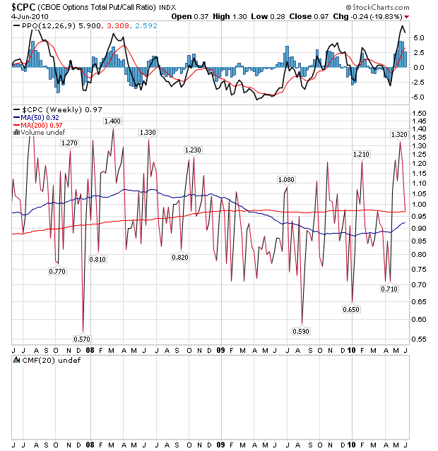 2010/06/05 - Newジェントルマンさんの株式ブログ。タイトル:「NY も騙された人が多い?」 本文:CPC(プット/コールレシオ)の週足を見るとまだ楽観的。 もっと落ちてもおかしくない。
