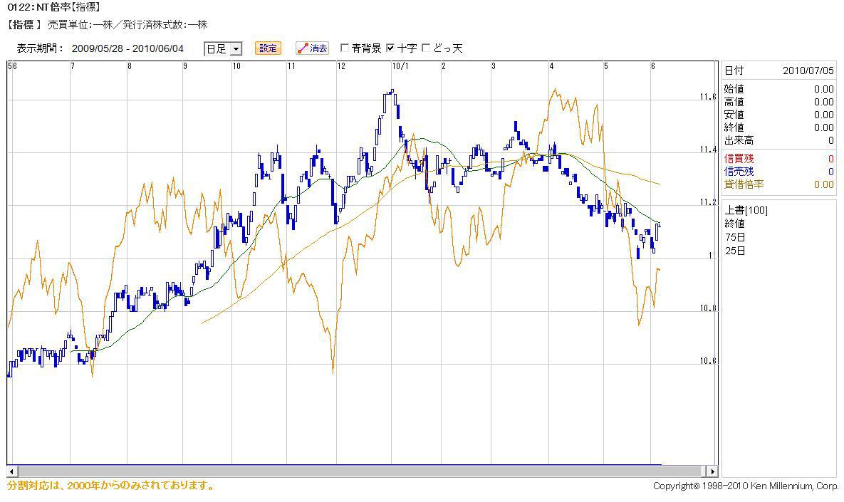 2010/06/05 - Newジェントルマンさんの株式ブログ。タイトル:「NT倍率とNK」 本文:NT倍率とNKの関係を見てみた。 NT倍率はきれいに25日線に押さえられている。 やはりこれは使えるわ。