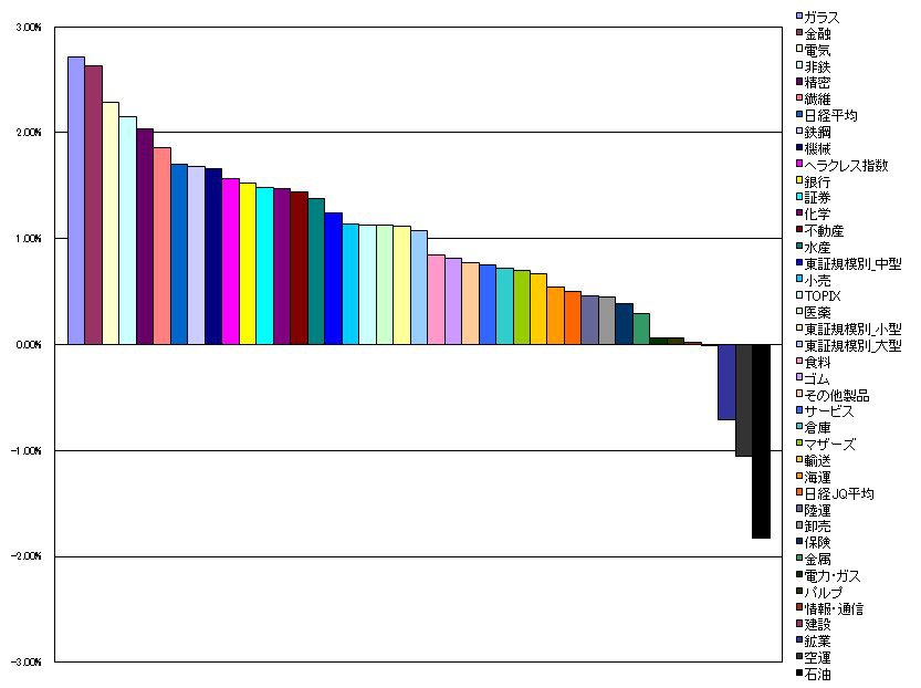 2010/06/11 - tetsuさんの株式ブログ。タイトル:「指数・業種別騰落ランキング」 本文:1.ガラス 2.71%(0.09%) 2.金融 2.63%(0.80%) 3.電気 2.29%(1.19%) 4.非鉄 2.15%(1.56%) 5.精密 2.03%(0.54%) 6.繊維