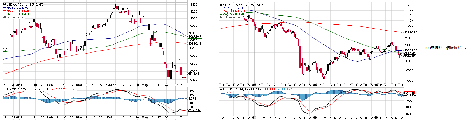 2010/06/12 - 月とスッポンさんの株式ブログ。タイトル:「来週のチャートポイント①」 本文:☆トレンドライン、ファンライン、下値支持ライン(画像1) ・日足でみても週足でみても、トレンドライン割れとなり、去年3月からの上昇トレンドは終了した事になる