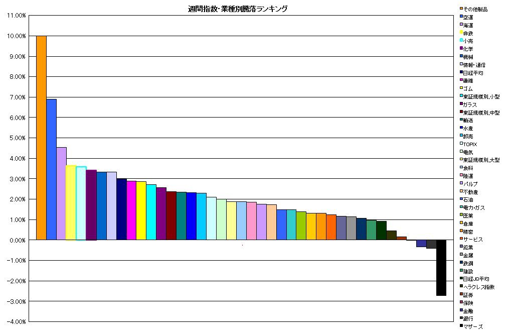 2010/06/18 - tetsuさんの株式ブログ。タイトル:「週間 指数・業種別騰落ランキング」 本文:1.その他製品 10.01%(-5.66%) 2.空運 6.89%(-1.05%) 3.海運 4.55%(-2.38%) 4.非鉄 3.65%(-2.72%) 5.小売