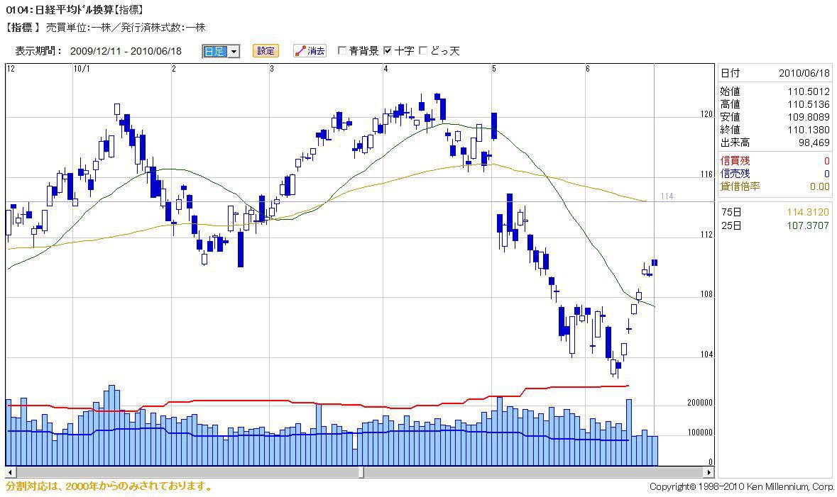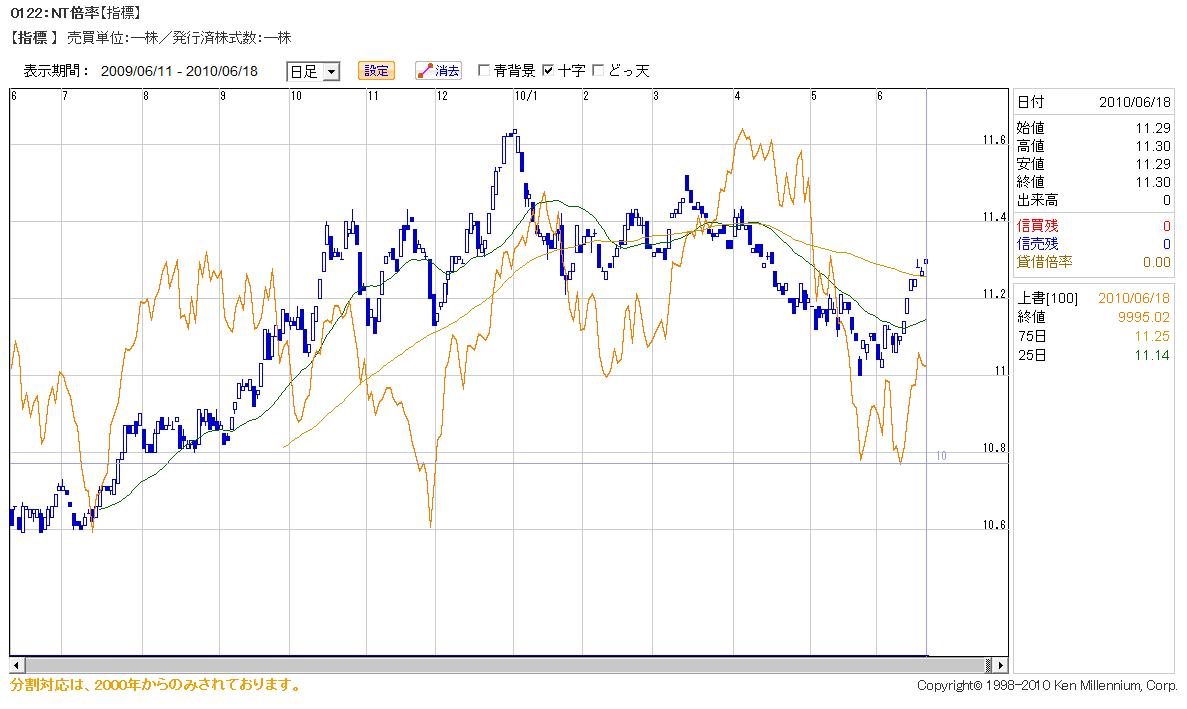 2010/06/20 - Newジェントルマンさんの株式ブログ。タイトル:「NT倍率 & ドル建てNK」 本文:NT倍率は上昇傾向。 ドル建てNKも上昇傾向。 ドル建てで$114~115程度、円にして10、300~10,400オーバーシュートで10,500程度の高値を想定しておく必要がありそうだ。