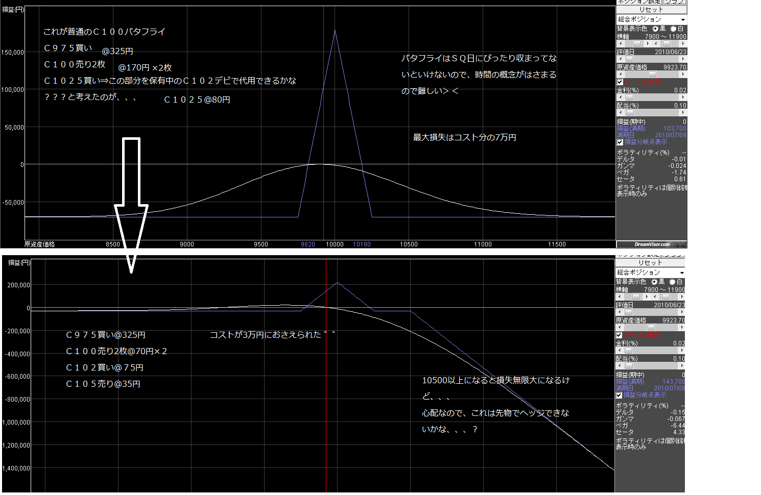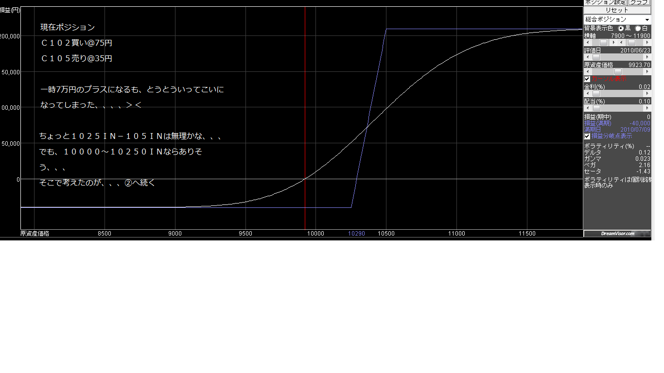 2010/06/23 - 月とスッポンさんの株式ブログ。タイトル:「オプション考察☆バタフライの変形について」 本文:保有中のC102-C105デビ、最大利益を狙ってたのですが、リカクし損ねました、、、^^;この保有ポジションをいかしつつ、なにか組み替えできないかな~ と考えてみました☆