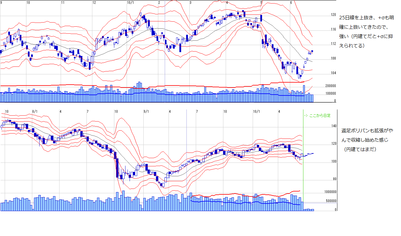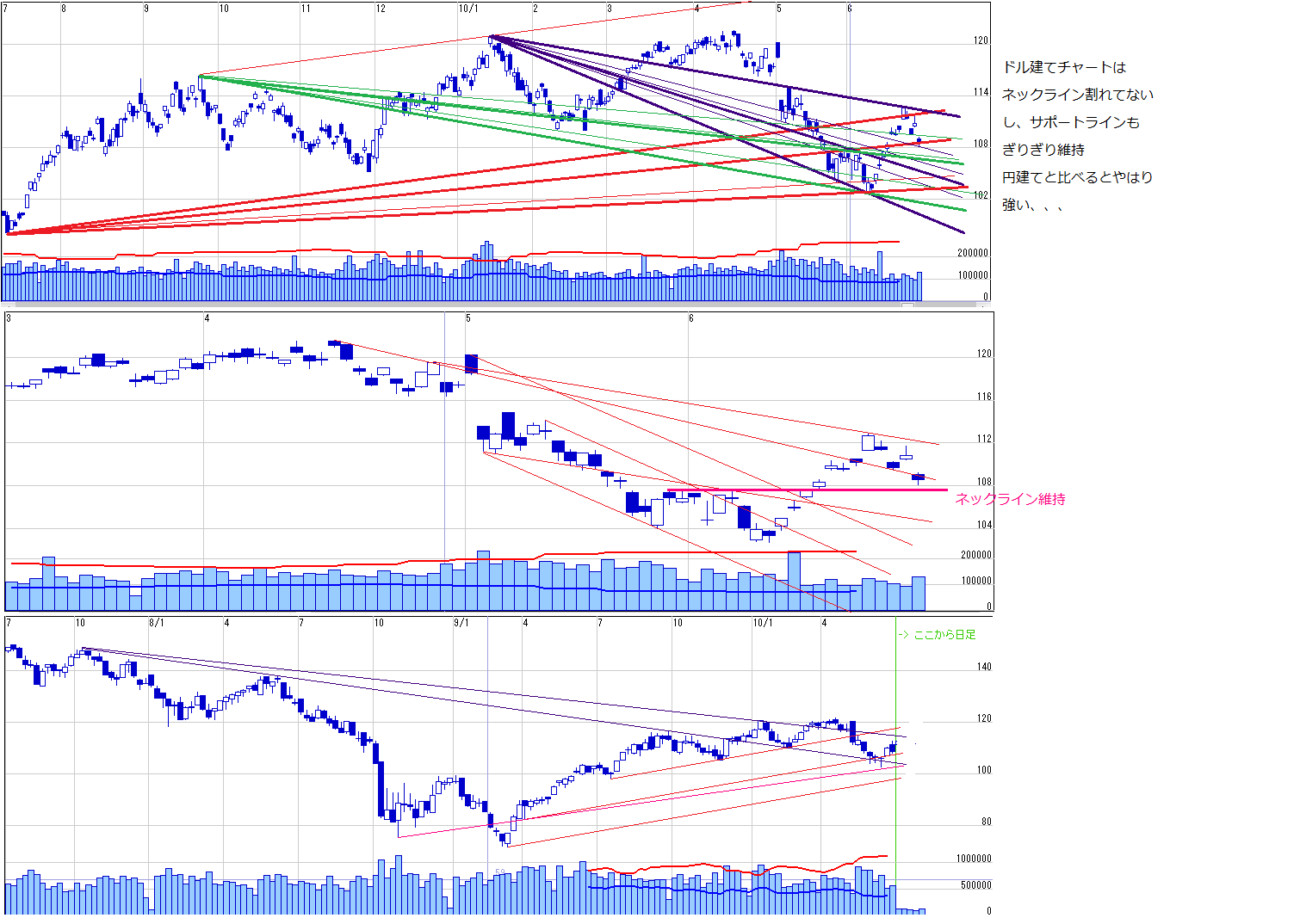 ドル建て日経は円建てより一足お先にW底をつけ、円建てより一足お先に反発入りし、円建てより一足お先に勝手にW底のターゲット値も達成、、、(円建て先物のW底ターゲットは10610だったのに、ドル建てがターゲット112ドルを勝手に達成してしまったため、達成感がでてしまった)