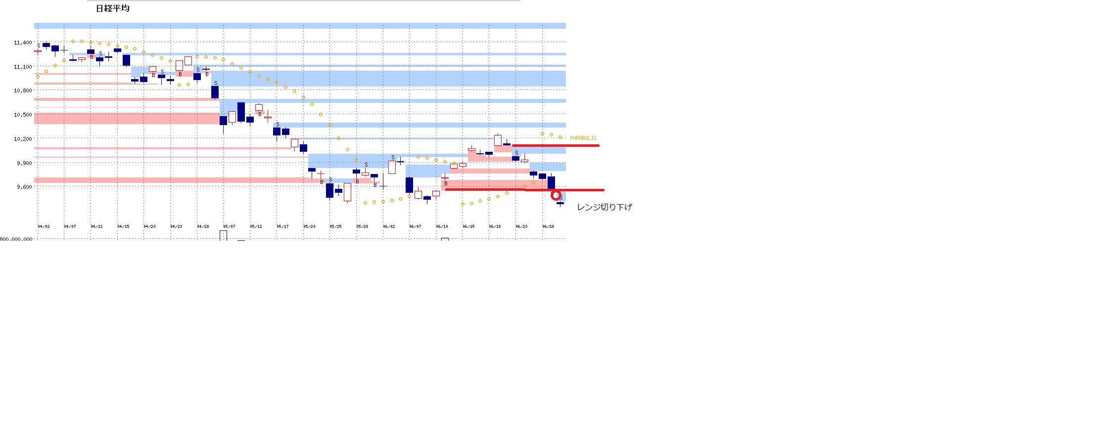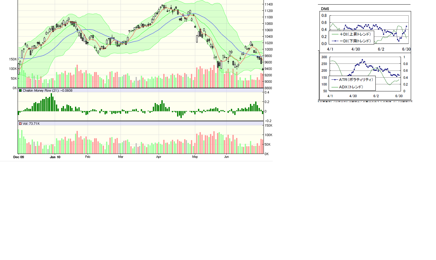 2010/06/30 - 月とスッポンさんの株式ブログ。タイトル:「6/30本日のチャート①」 本文:(1)本日のMPと週間MP (2)窓 (3)CMFとDMI