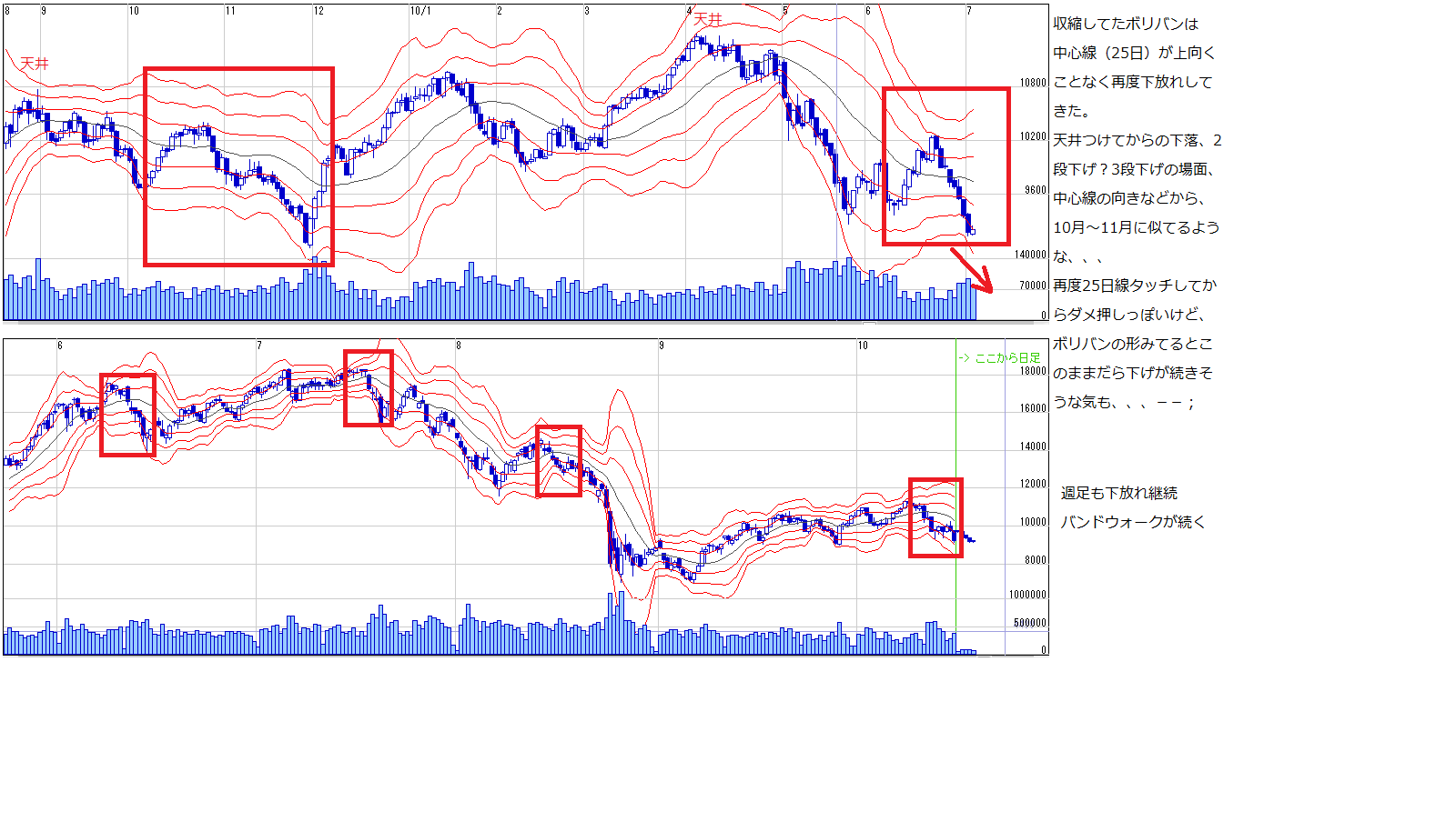 2010/07/03 - 月とスッポンさんの株式ブログ。タイトル:「来週のチャートポイント①」 本文:☆トレンドライン、ファンライン、下値支持ライン(画像1) ☆移動平均線(画像2) ☆ボリバン(画像3) ボリバンの収縮についてはこちら