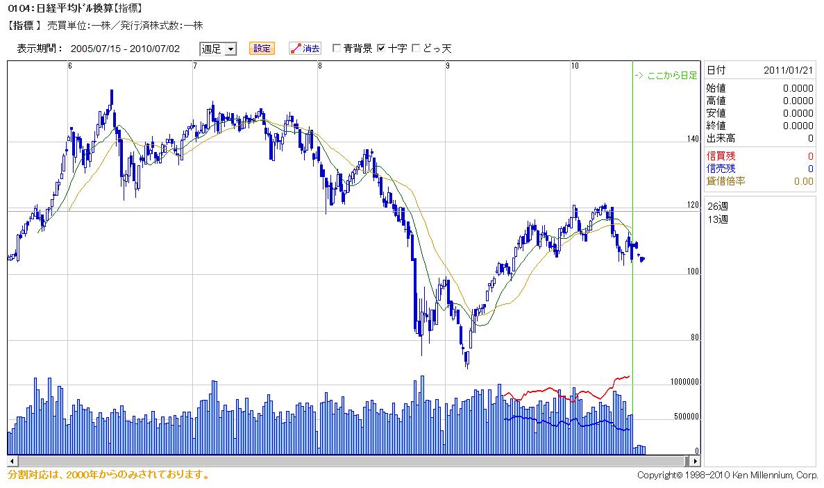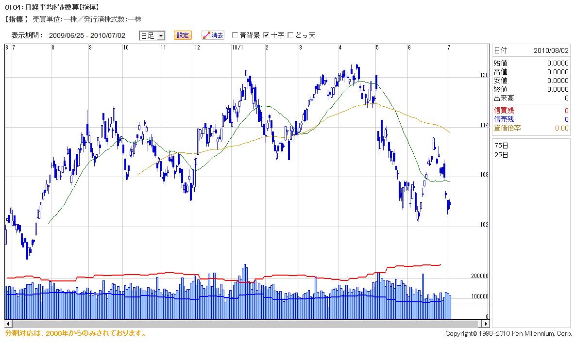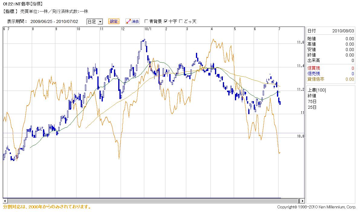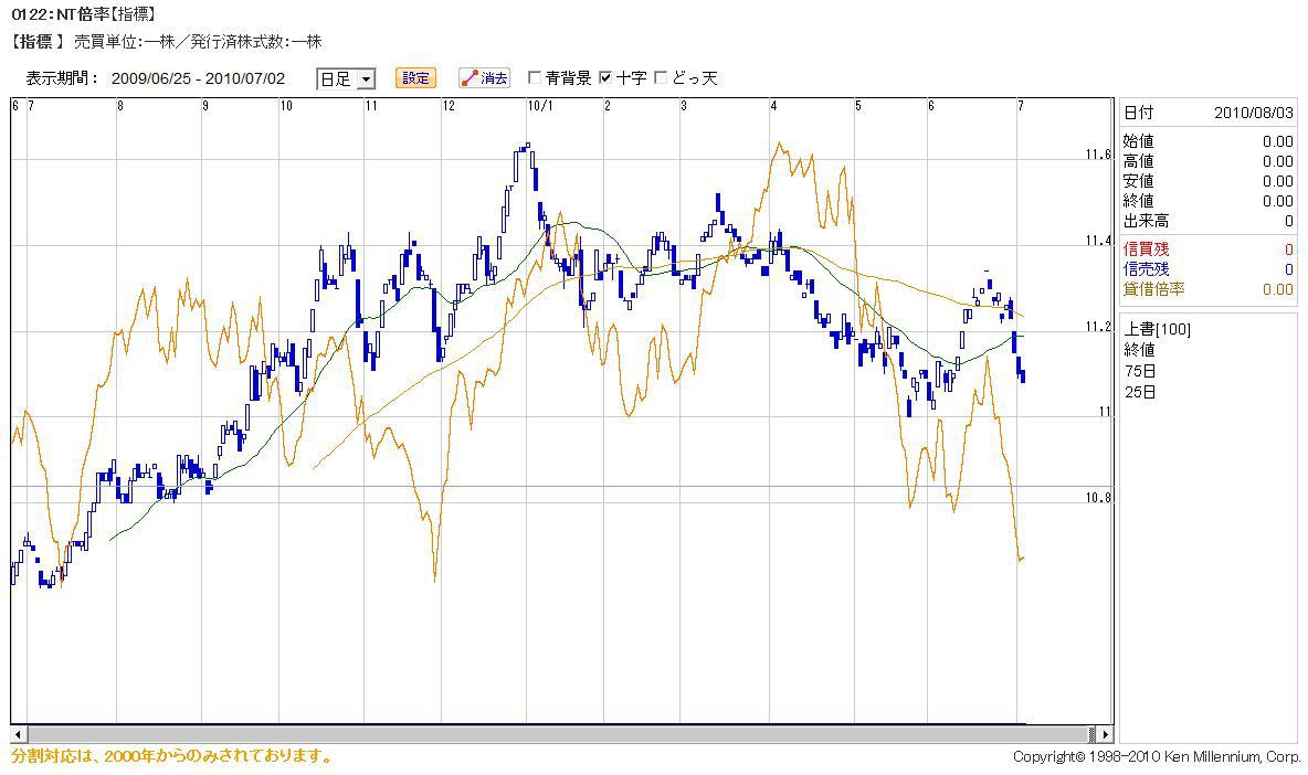 2010/07/04 - Newジェントルマンさんの株式ブログ。タイトル:「NT倍率 & $建てNK」 本文:両方ともチャートがかなり悪化している。 下げ止まりをじっくりと待つしかないだろう。 修復は困難な状況に見える。 ”押し目”という状況ではないだろう。 「下げの序章」と解釈する。