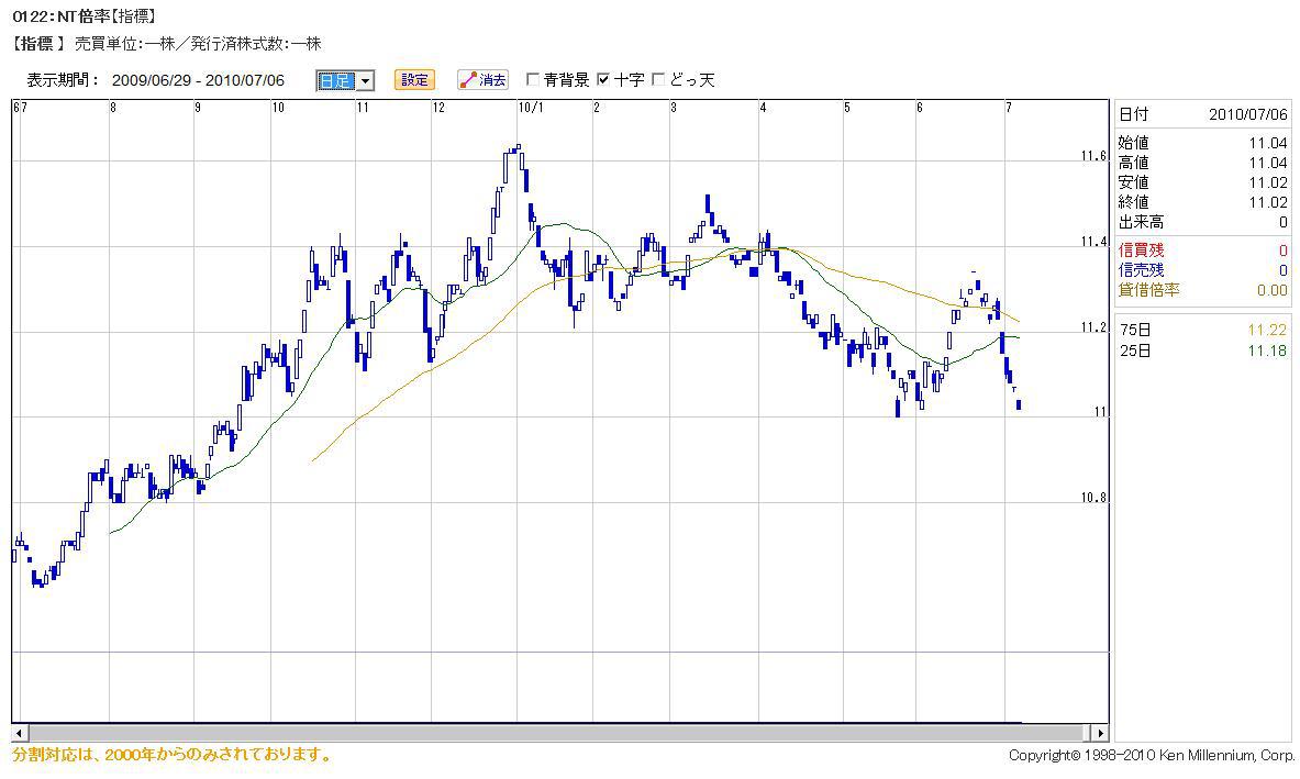 2010/07/06 - Newジェントルマンさんの株式ブログ。タイトル:「NT倍率 & ドル建てNK」 本文:NK上げもNT倍率は低下。 ドル建てNKは驚く程のアゲでもない。