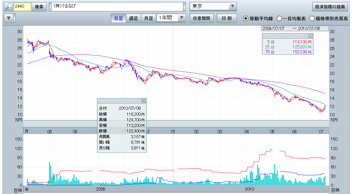 2010/07/07 - rikakusenninさんの株式ブログ。タイトル:「2440:ぐるなびに買いサインとな???」 本文:2440:ぐるなびに買いサイン発生です ここもいわゆる中国人観光客爆発関連銘柄でしょう 無借金です 今122400ですが、200000くらいにはなりますでしょ? さて???